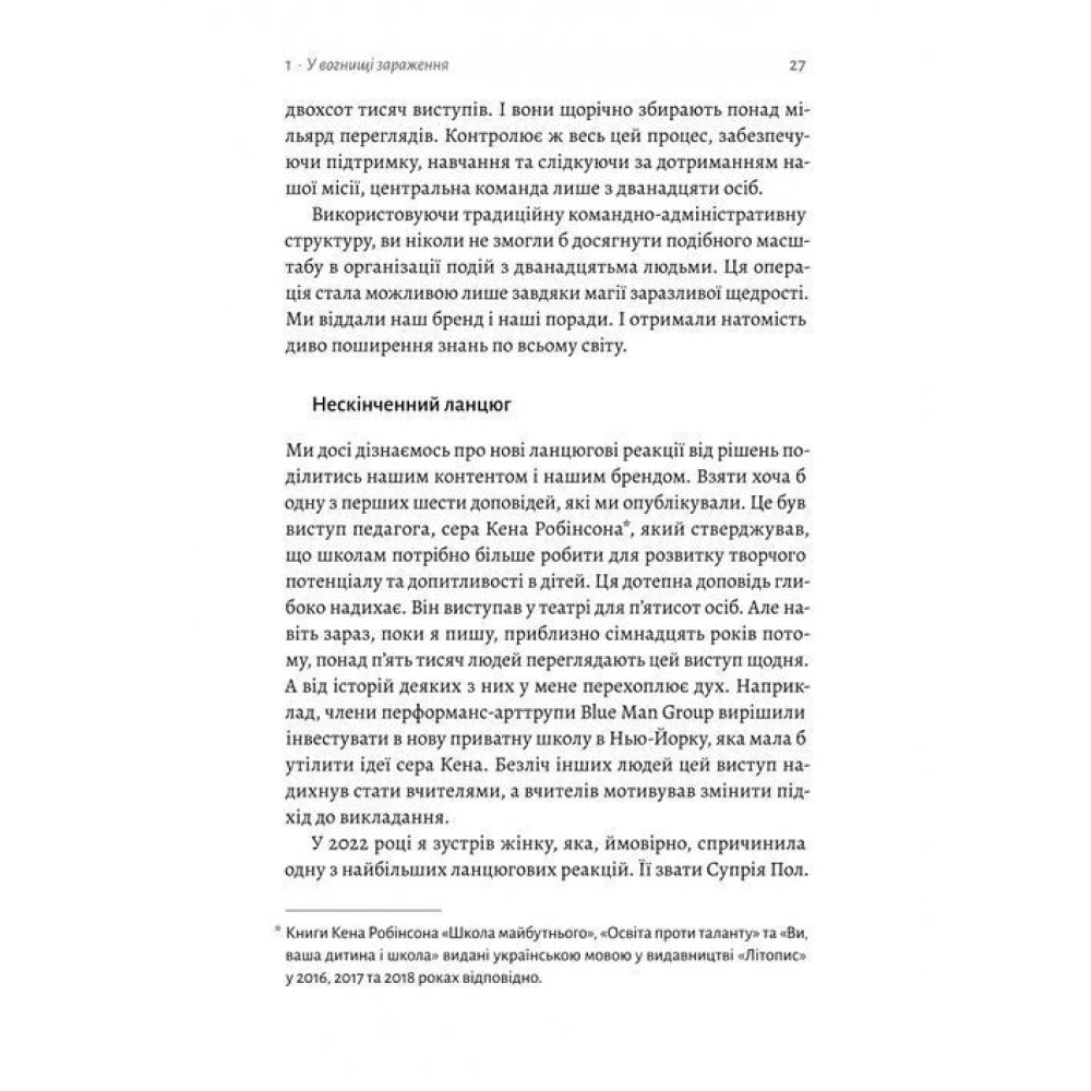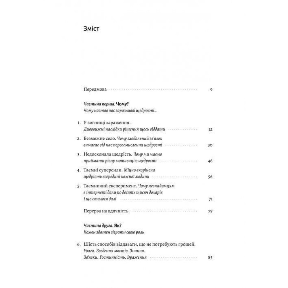 Лондонський перукар, який почав пропонувати стрижки людям без даху над головою і став каталізатором цілого руху. Двоє анонімних жертводавців, що роздали по десять тисяч доларів для двохсот незнайомих людей, і виявили, що більшість отримувачів хочуть «віддячити» своїми щедрими вчинками. І TED, який перетворився з нішевого щорічного саміту на глобальний маяк ідей, транслюючи доповіді онлайн і надаючи мільйонам людей доступ до безплатного навчання.