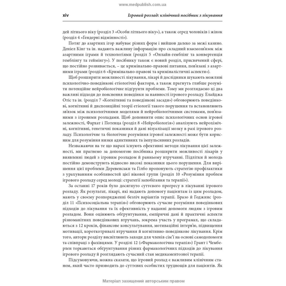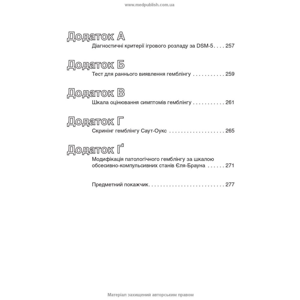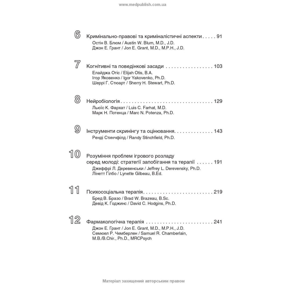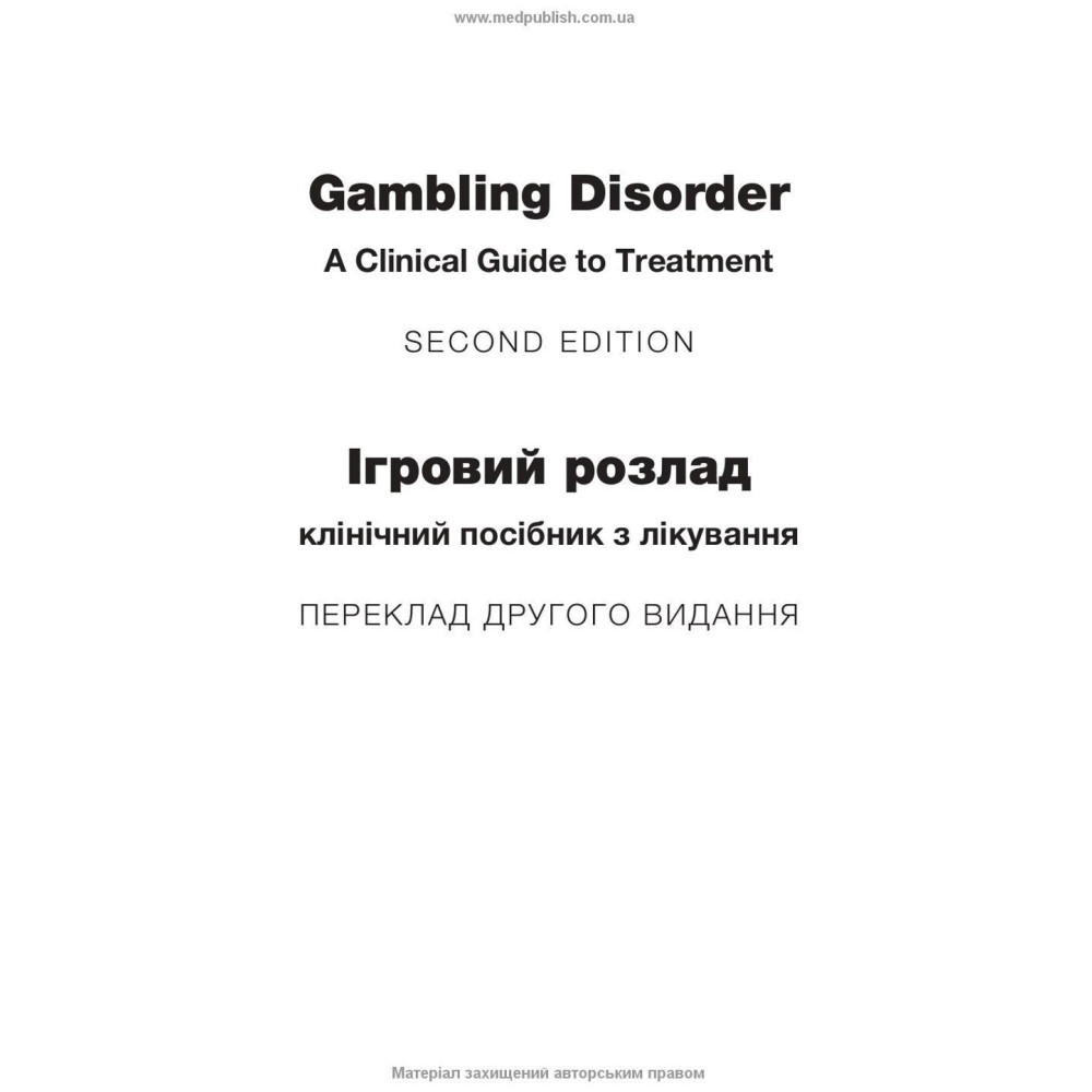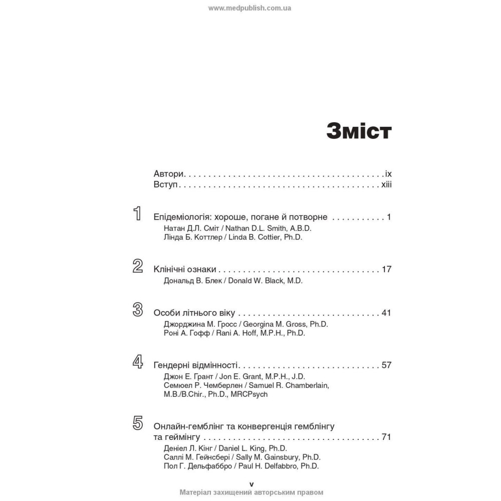 У книзі також розглядаються особливості прояву розладу в різних гендерних групах, у пацієнтів старшого й молодшого віку. Висвітлено криміналістичні аспекти й відносно нову галузь дослідження — азартні онлайн-ігри та зв’язок між азартними й відеоіграми.