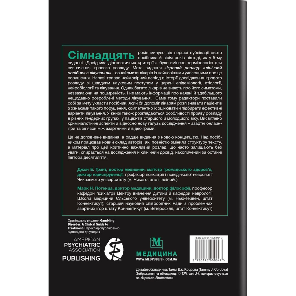 Мета видання «Ігровий розлад: клінічний посібник з лікування» від Джона Е. Гранта й Марка Н. Потенци — ознайомити лікарів із найновішими уявленнями про це порушення. Наразі триває неймовірний період в історії дослідження ігрового розладу зі швидким науковим поступом у царині епідеміології, етіології, нейробіології та лікування.