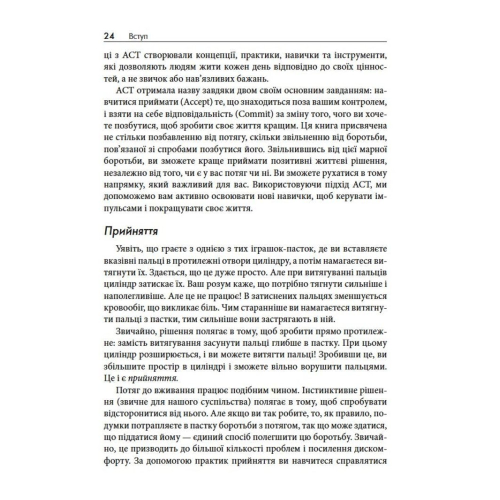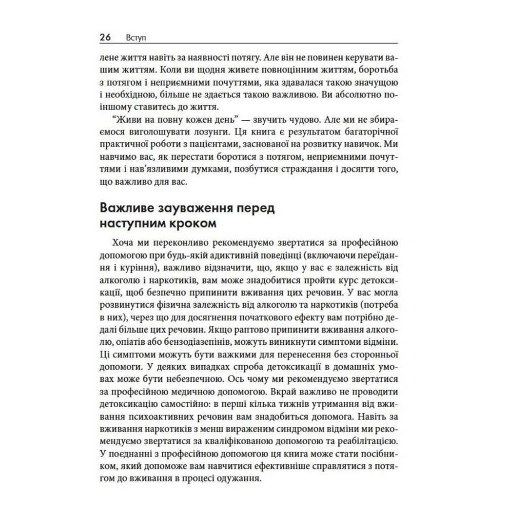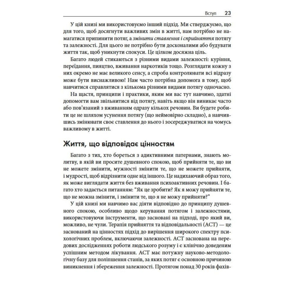 У книзі «Терапія прийняття та відповідальності у подоланні адиктивної поведінки» дві досвідчені клінічні психологині Марія Карекла та Меган М. Келлі пропонують науково обґрунтований підхід: терапію прийняття та відповідальності (ACT). Це не чергові поради про силу волі, а практичний посібник, завдяки якому ви дізнаєтеся, як розпізнавати тригери, зменшувати вплив згубних сценаріїв і рухатися до життя, яке відповідає справжнім цінностям.