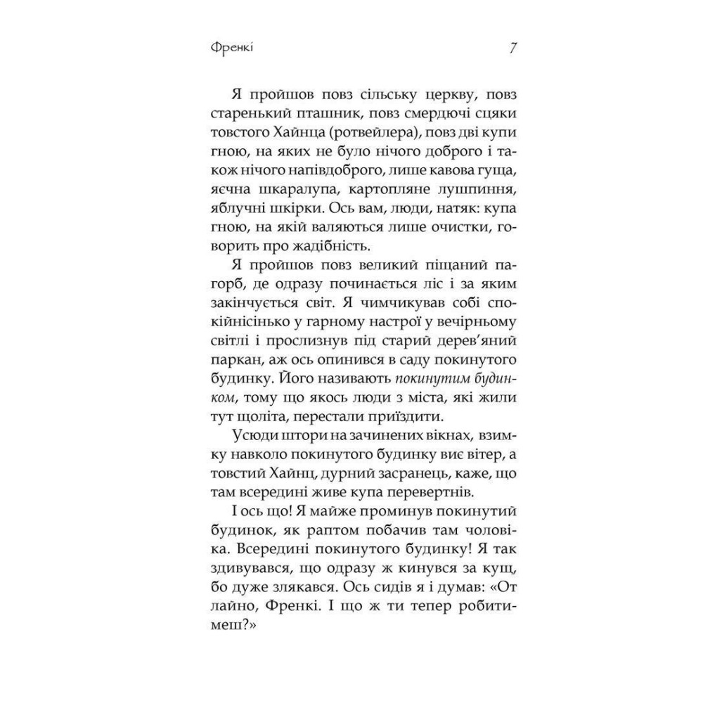 «Френкі» від Йохена Гуча та Максима Лео — роман глибокий, легкий, смішний і трагічний… він про те, як вижити навіть в такі моменти, коли смисли втрачено і не залишилось нікого, хто втримав би від стрибка у прірву. Дивує те, що рятівну інструкцію до виживання для головного героя складає не якийсь психолог з багаторічним стажем, а звичайний кіт Френкі, для якого справжній сенс життя — це корм з соусом, фільми про тварин, гора сміття, з якої видно зірки, і навіть ванна догори дном, та йому цього вдосталь для щастя… Проте є ще дещо — і про це Френкі розкаже лише своїй людині, близькій та довіреній.