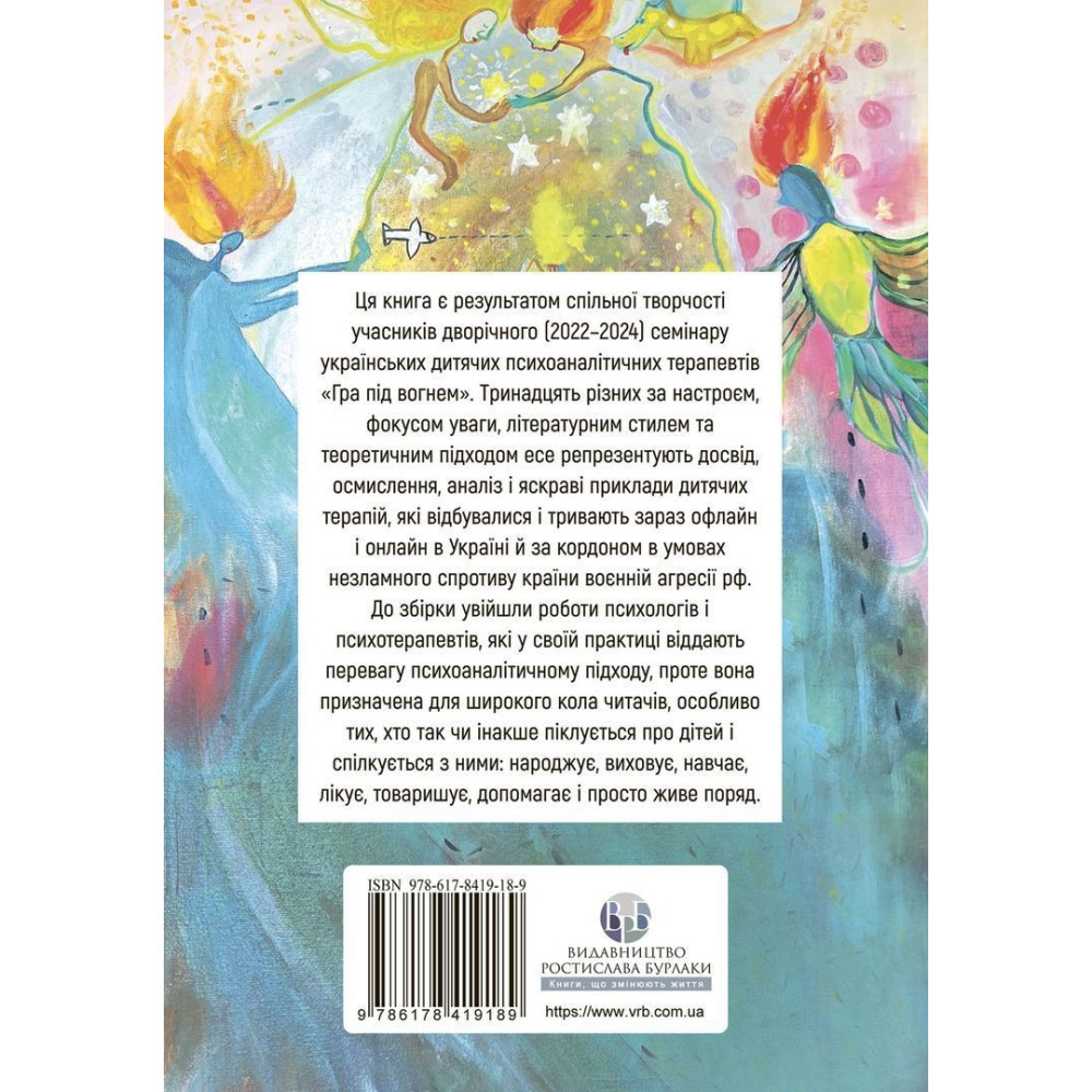 Книга «Гра під вогнем. Історії, робота, спостереження, думки українських психоаналітичних дитячих терапевтів під час війни» є результатом спільної творчості учасників дворічного (2022–2024 рр.) семінару українських дитячих психоаналітичних терапевтів «Гра під вогнем» під керівництвом досвідченої психоаналітикині Анни Кравцової.