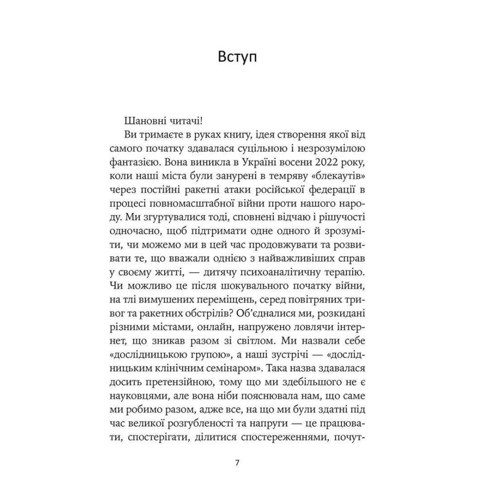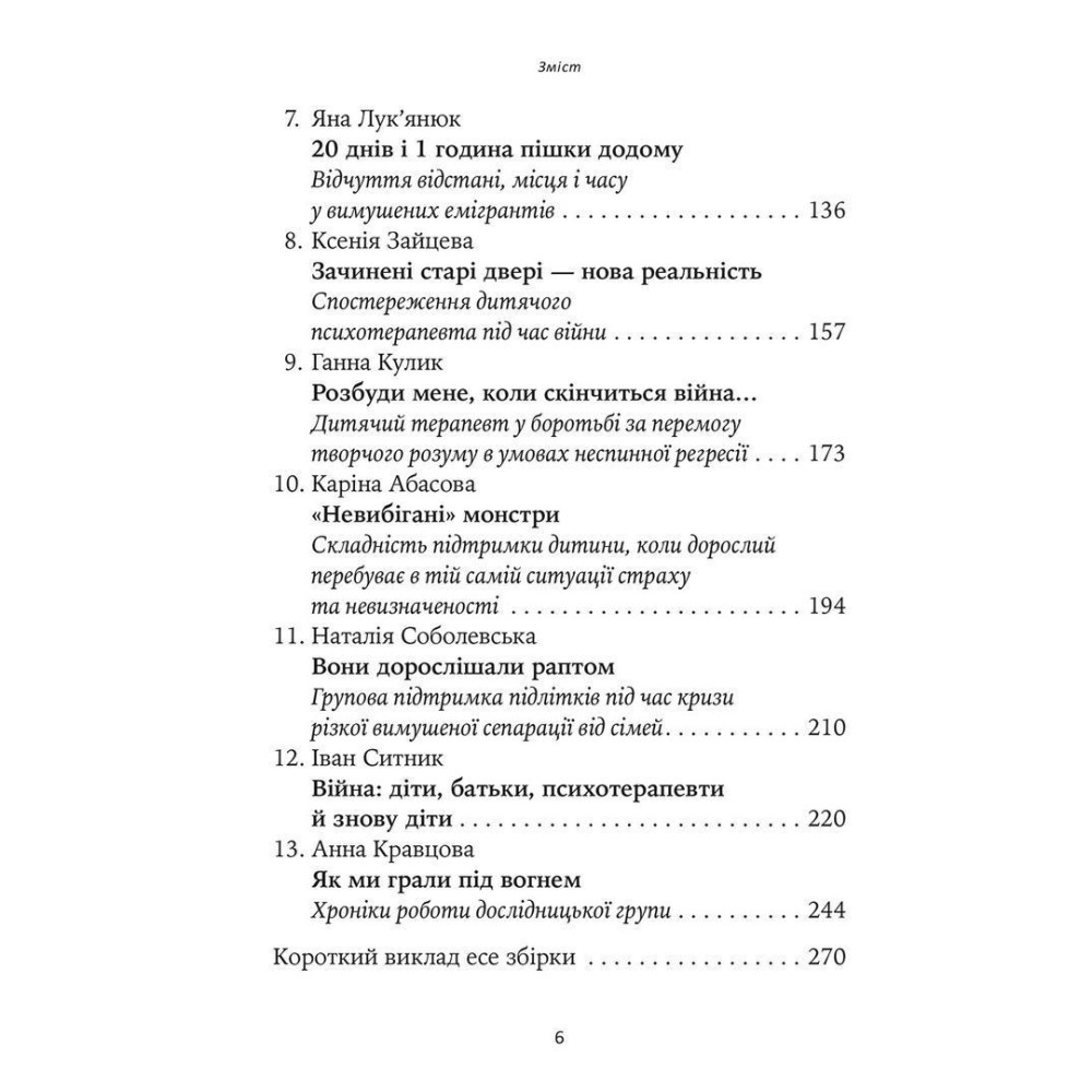 Тринадцять різних за настроєм, фокусом уваги, літературним стилем та теоретичним підходом есе репрезентують досвід, осмислення, аналіз та яскраві приклади дитячих терапій, які відбувалися і тривають зараз офлайн і онлайн в Україні й за кордоном в умовах незламного спротиву країни воєнній агресії РФ.