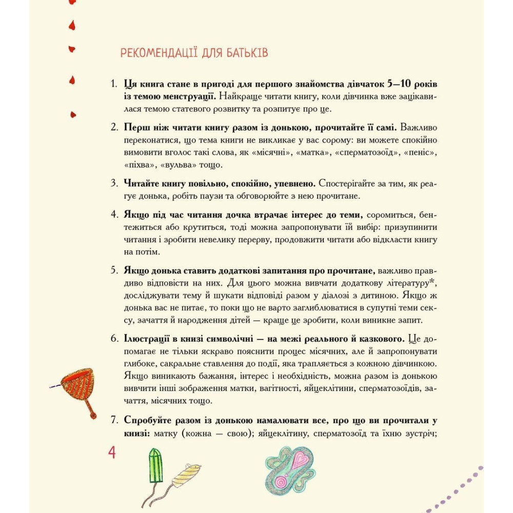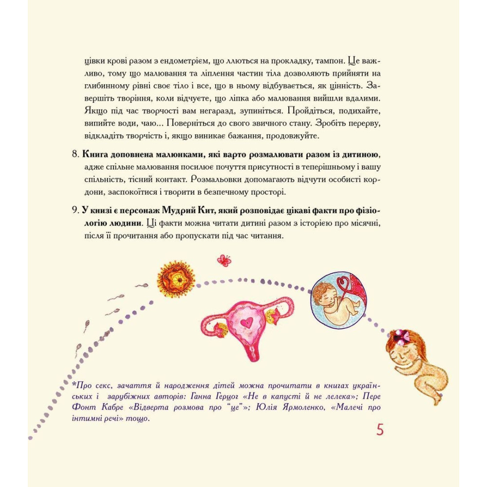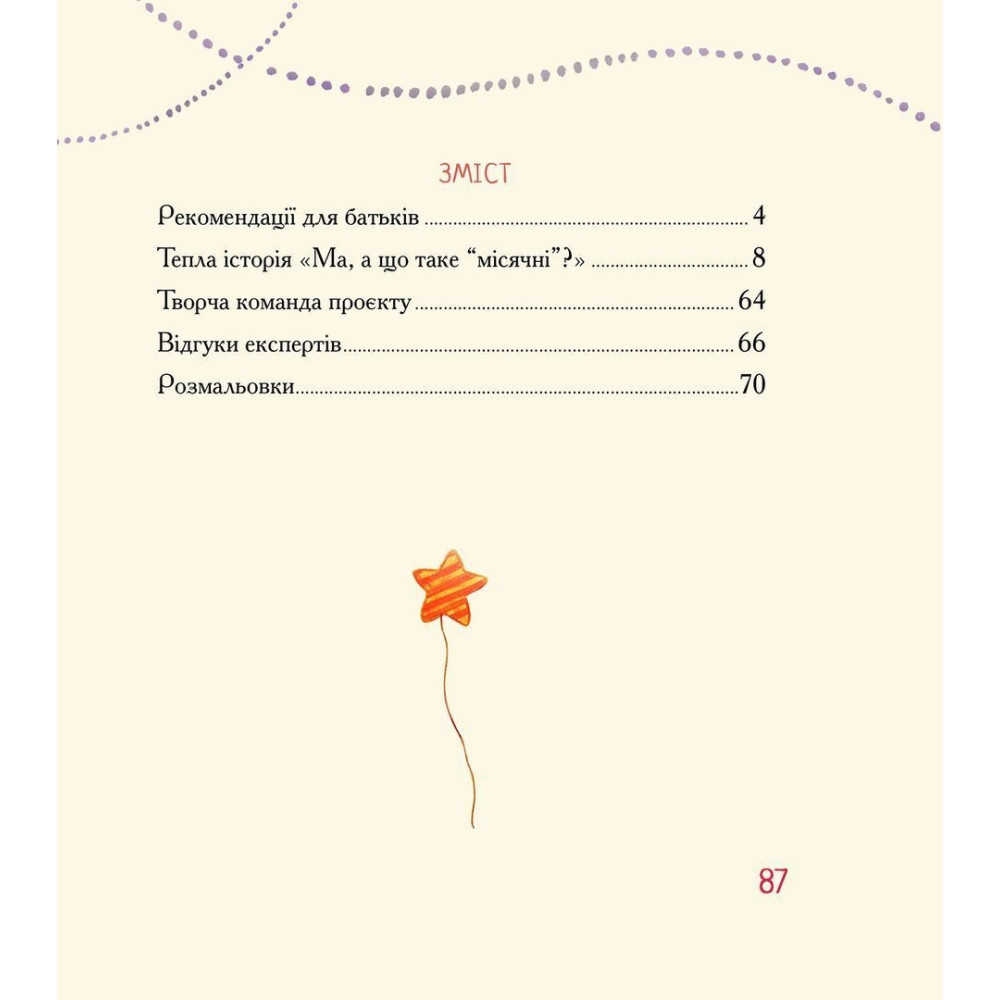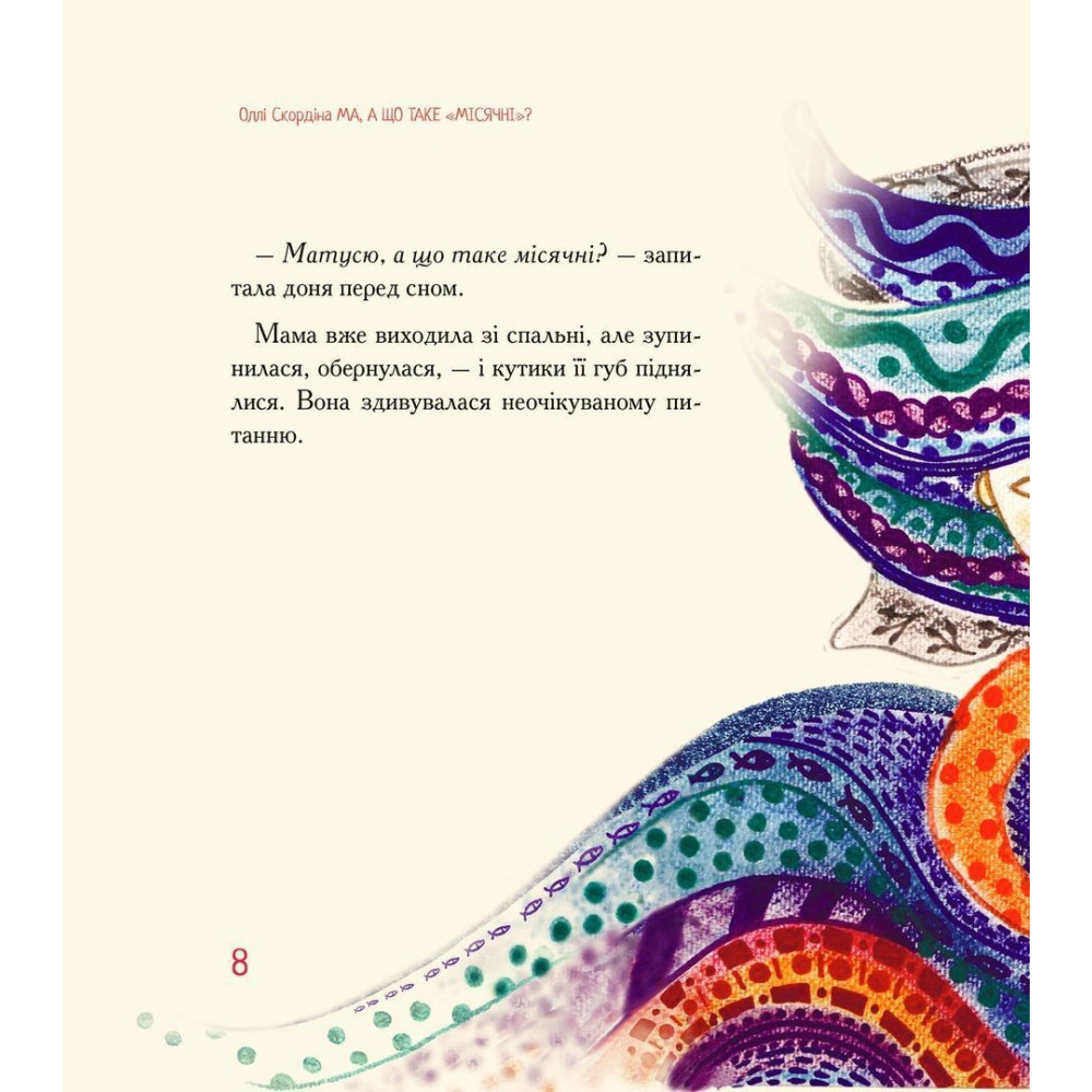 Книжка «Ма, а що таке «місячні»?» від Оллі Скордіної запросить дівчинку у світ зростання й дорослішання: на простих прикладах описані фізіологічні процеси, що відбуваються в жіночому тілі. Завдяки дбайливому підходу у маленької жінки формується природнє й приємне сприйняття теми місячних і жіночої ідентичності.