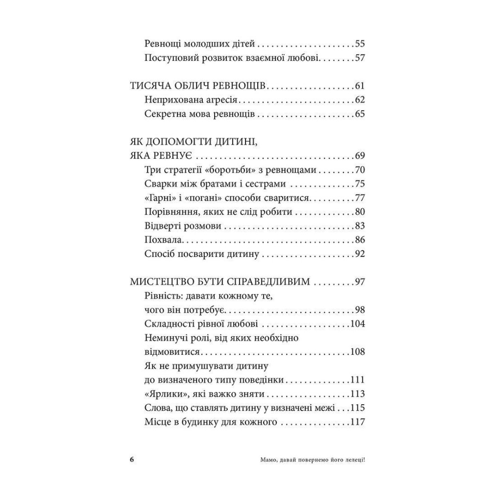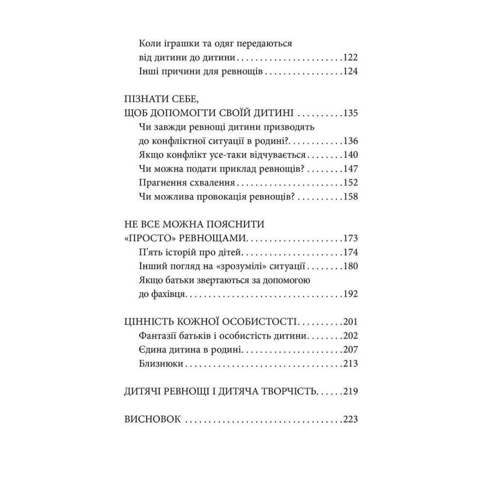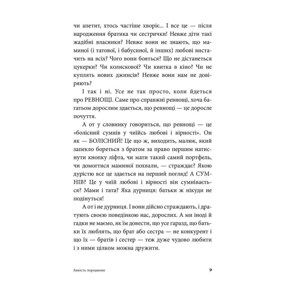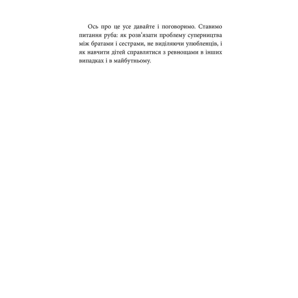 Авторка розповідає про особливості прояву ревнощів у дітей молодшого шкільного віку та підлітків, як діти маскують свої емоції. У книзі знайдете інструкції, як треба діяти, щоб така агресія не розквітла на повну силу і щоб конфлікт не перейшов у громадянську війну між нащадками. Авторка пропонує три стратегії боротьби з дитячими ревнощами і рекомендує батькам дотримуватися принципу справедливості у ставленні до дітей. Як це зробити? Чітка інструкція, що міститься у книзі, допоможе впоратися з дитячою війною за любов батьків.