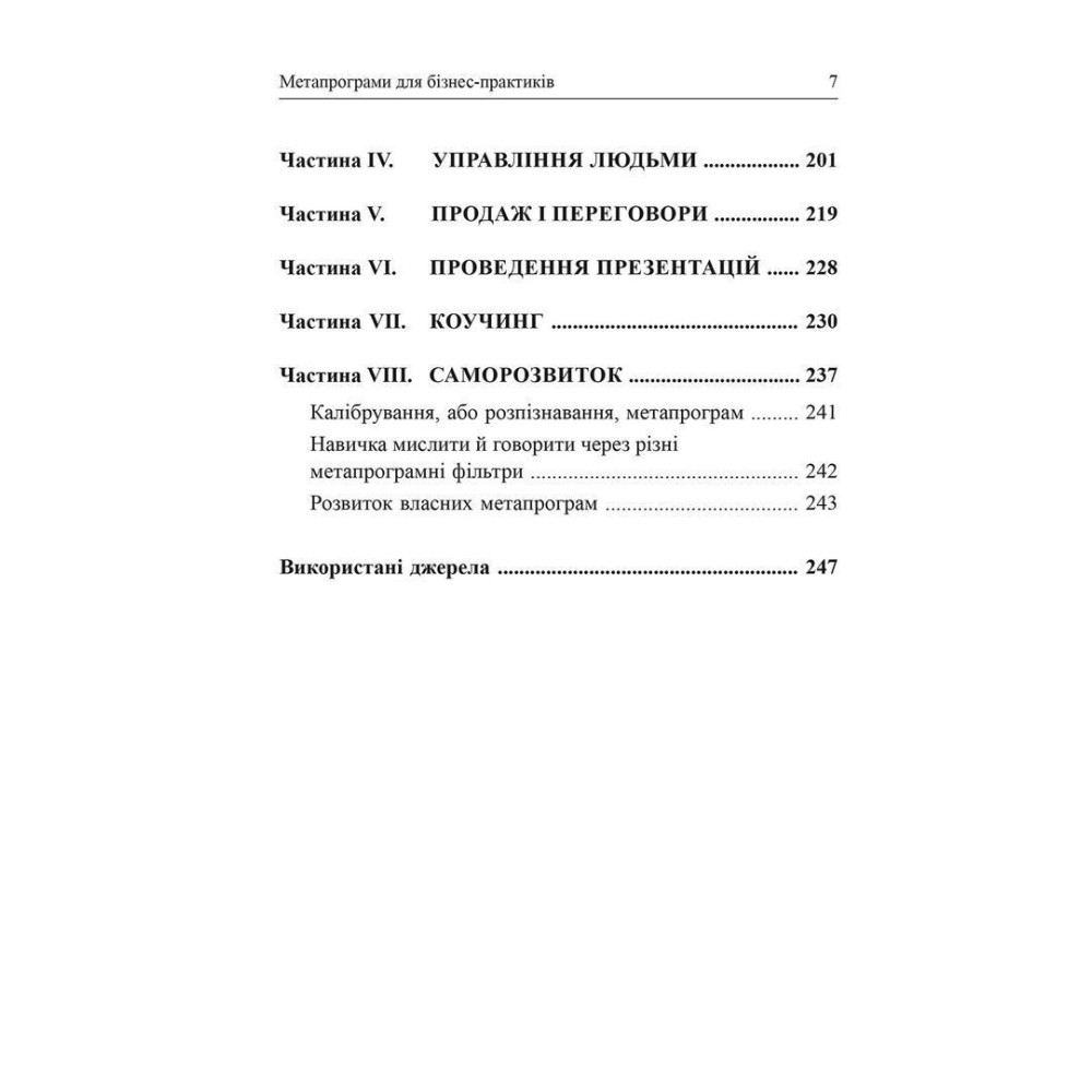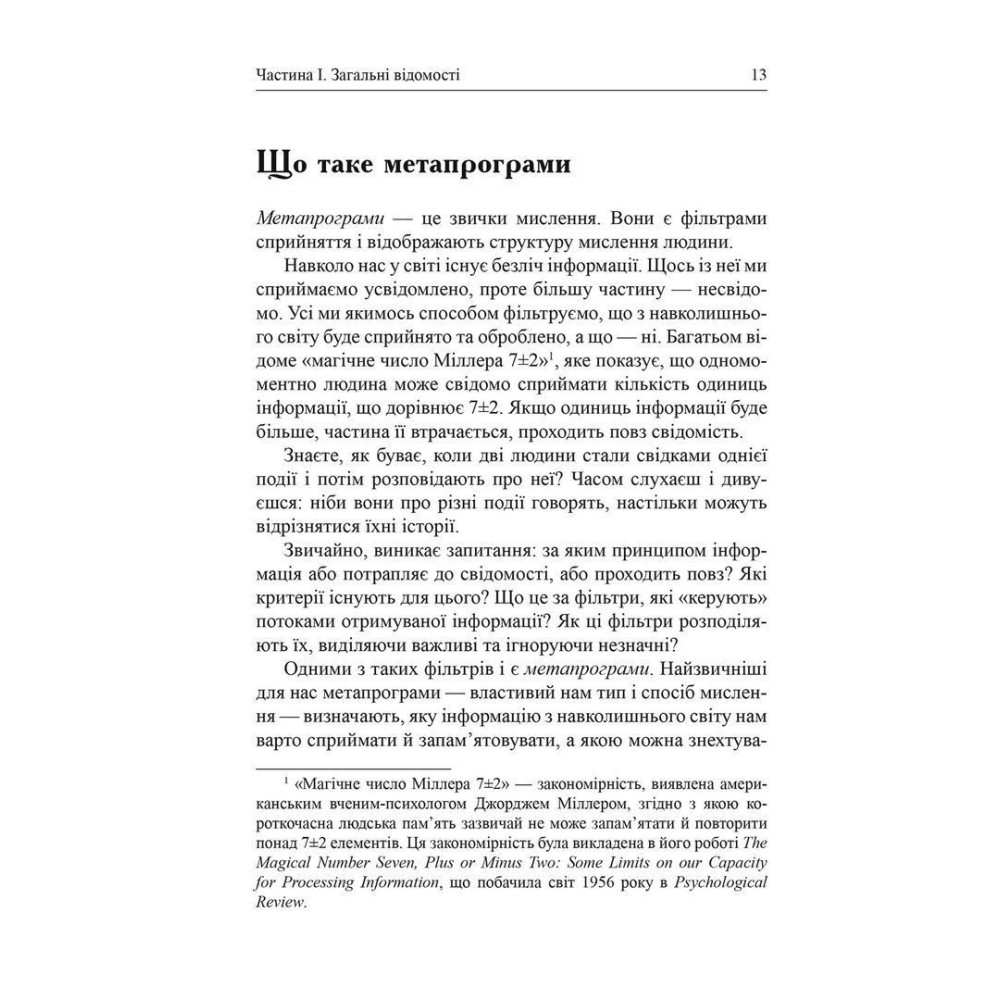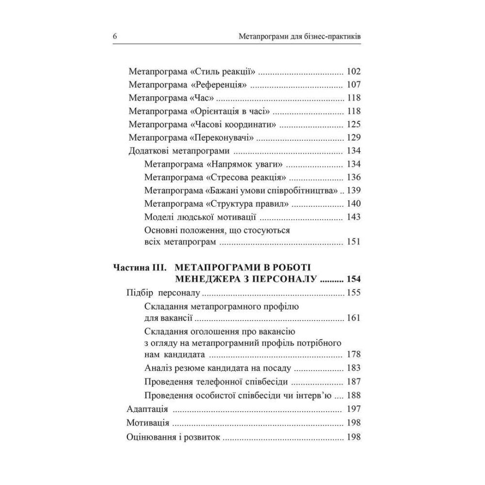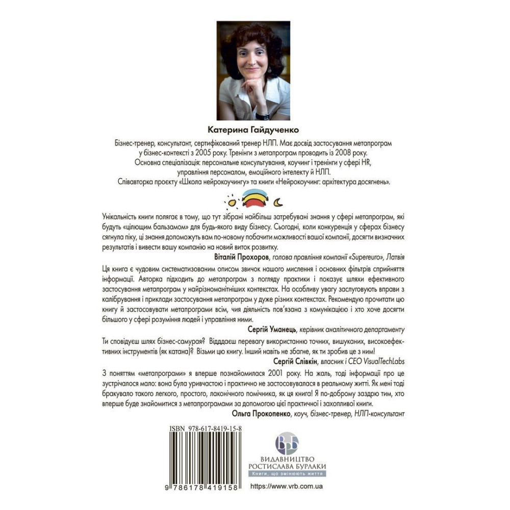 Уже понад 30 років у всьому світі метапрограми успішно застосовують у бізнесі. У книзі ви знайдете не тільки детальний опис метапрограм із численними прикладами їх прояву, а й практичні рекомендації щодо можливості використання їх у таких сферах, як HR, управління персоналом, продаж і саморозвиток.