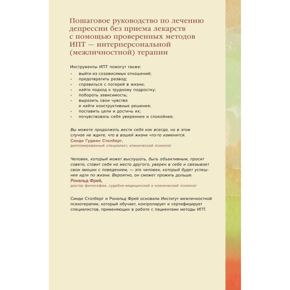Клінічні психологи Сінді Ґудман Столберг і Рональд Фрей упевнені, що запорука міцного душевного здоров'я — не дорогі препарати, а здорові взаємовідносини з оточуючими, від друзів і родичів до колег і знайомого перукаря. Понад 20 років вони практикують інтерперсональну (міжособистісну) психотерапію, що допомагає витягти максимум із стосунків, які підтримують, поліпшити проблемні та, якщо потрібно, завершити шкідливі й руйнівні.