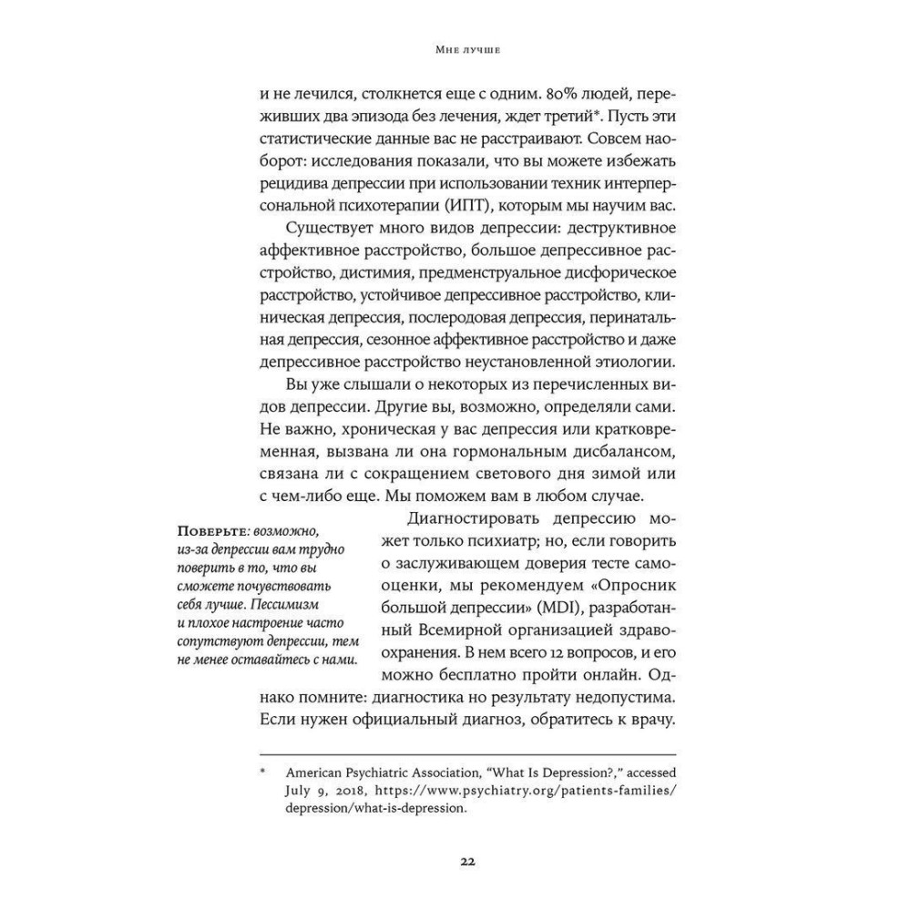 Книжка «Мне лучше. Межличностная терапия против депрессии» за авторством Сінді Ґудман Столберг й Рональда Фрея — це покроковий посібник із вправами й тестами, який за 8-12 тижнів допоможе відчути себе краще та впоратися зі складними життєвими обставинами: запобігти розлученню, пережити розставання, знайти підхід до підлітка, вийти із залежних стосунків тощо.