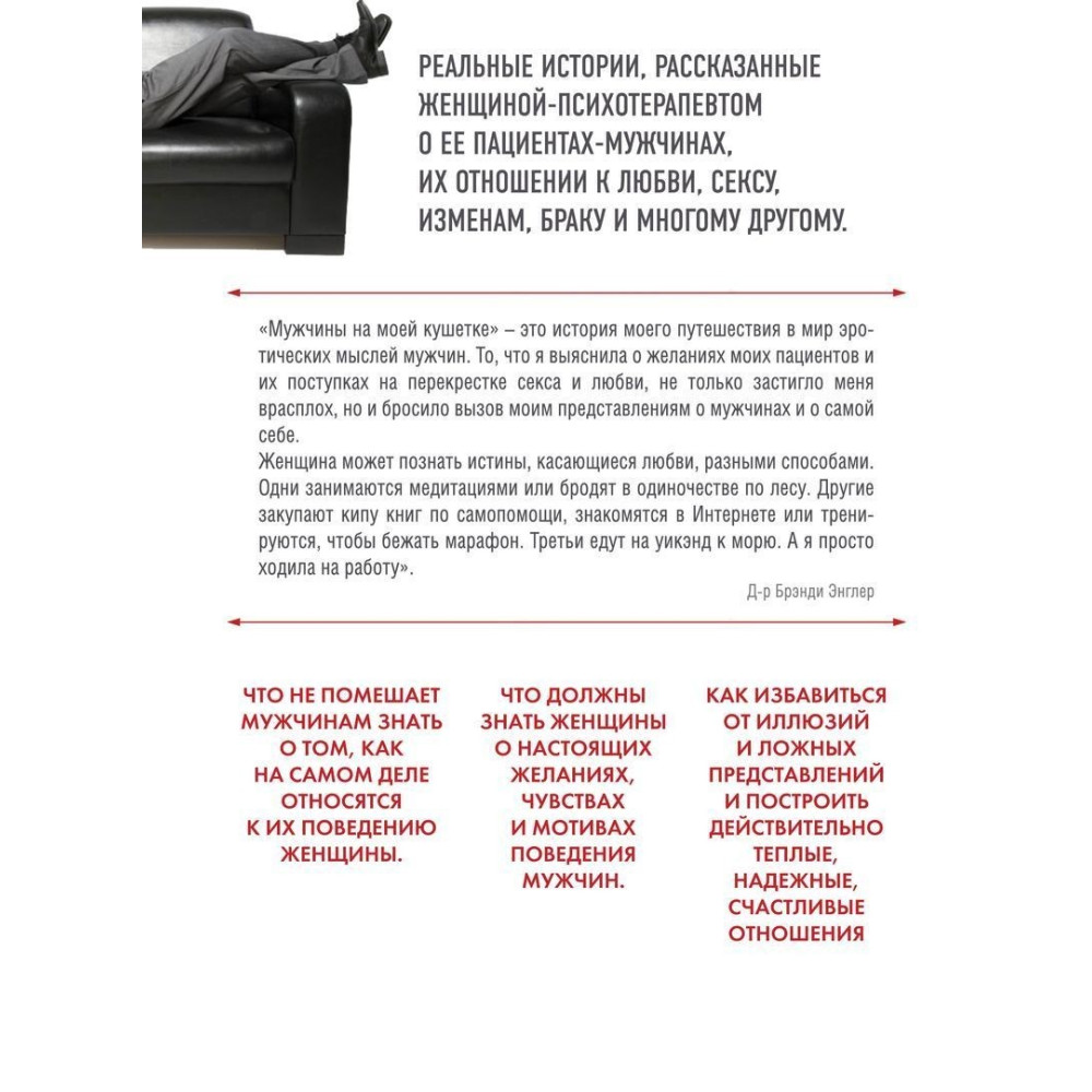«Мужчины на моей кушетке. Реальные истории о любви, сексе и психотерапии» за авторством Бренді Енглер — книжка, яку має прочитати кожна жінка, котра бажає зрозуміти, чого насправді хочуть чоловіки, і кожен чоловік, який, безумовно, знає, що хоче, але не проти з'ясувати, що про це думають жінки.