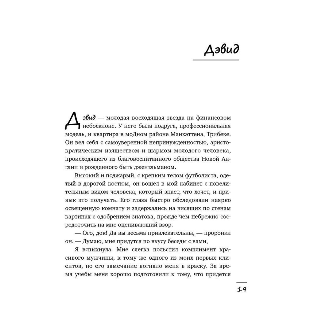 Коли молода психотерапевтка Бренді Енглер відкрила приватну практику в Нью-Йорку, на неї чекав великий сюрприз. Більшість пацієнтів становили чоловіки: Девід, висхідна зірка Волл-стріт, який не пропускає жодної спідниці; Чарльз, бізнесмен, що конфліктує з нареченою, тому що вона «занадто гарна для нього»; Пол, службовець банку, одружений з приголомшливо сексуальною жінкою, який при цьому регулярно відвідує «масажні» салони; та багато інших, не менш цікавих персон.