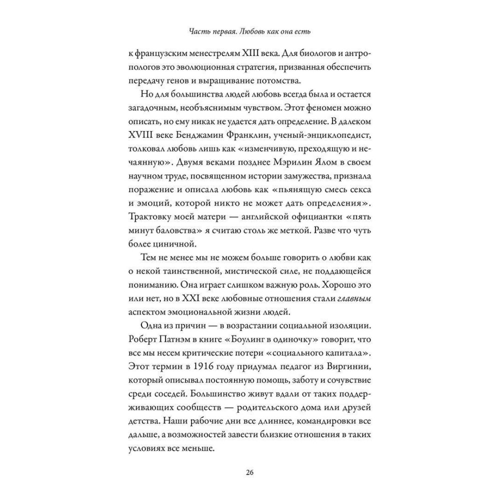 Книга складається з трьох частин. Частина перша відповідає на одвічне запитання «Що таке кохання?» та пояснює, як ми втрачаємо близькість, а слідом за нею любов, хоч і хотіли як краще, хоч і все розуміли. У ній зібрано дані досліджень, присвячених коханню та стосункам.