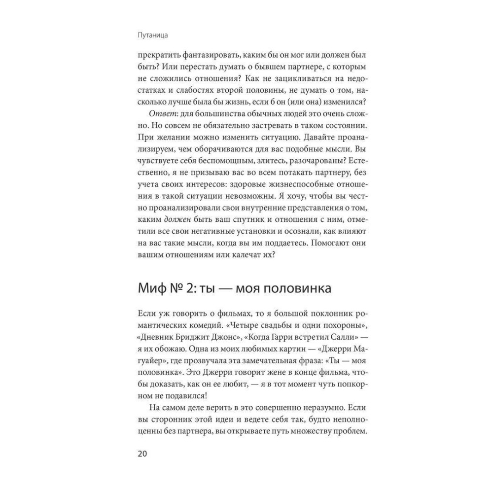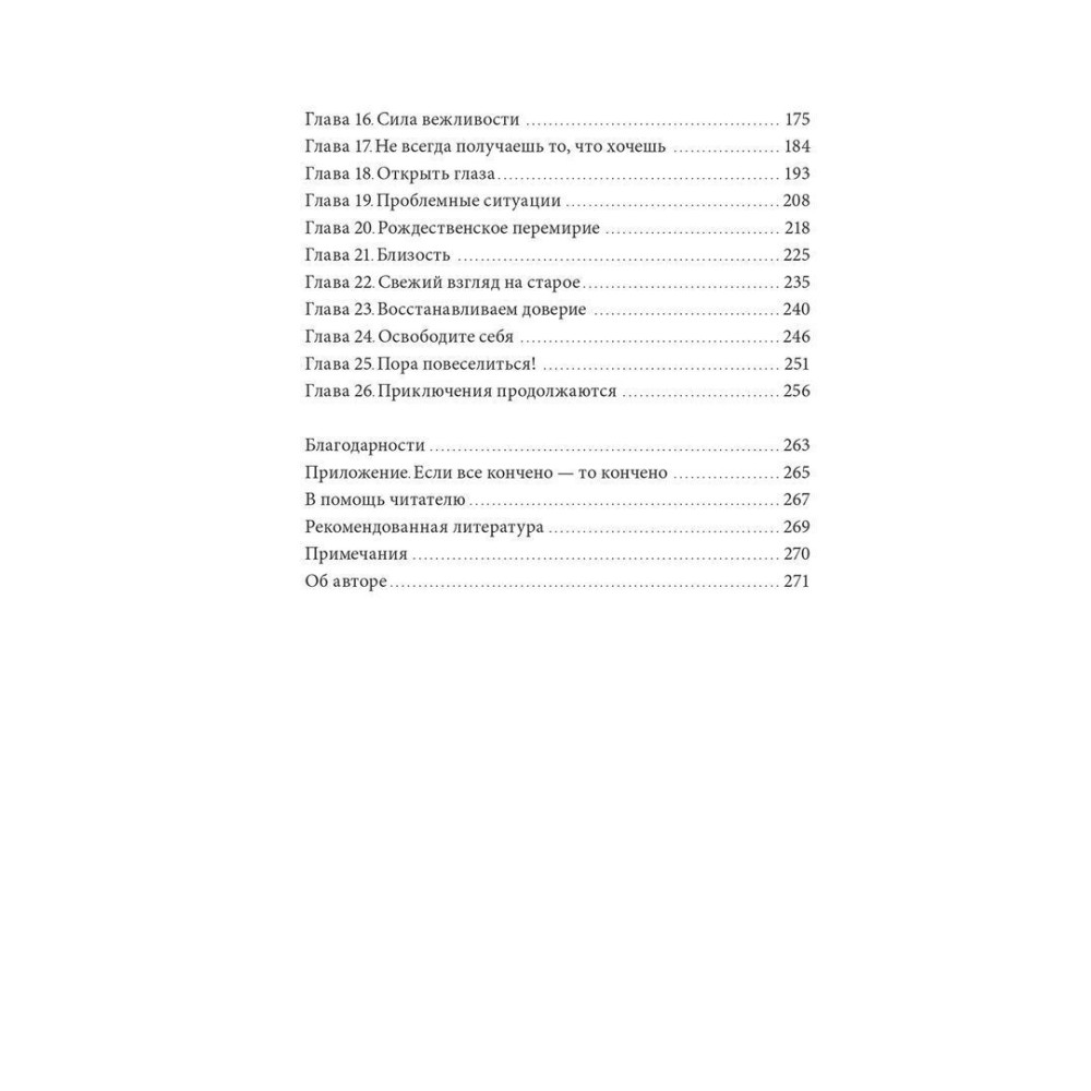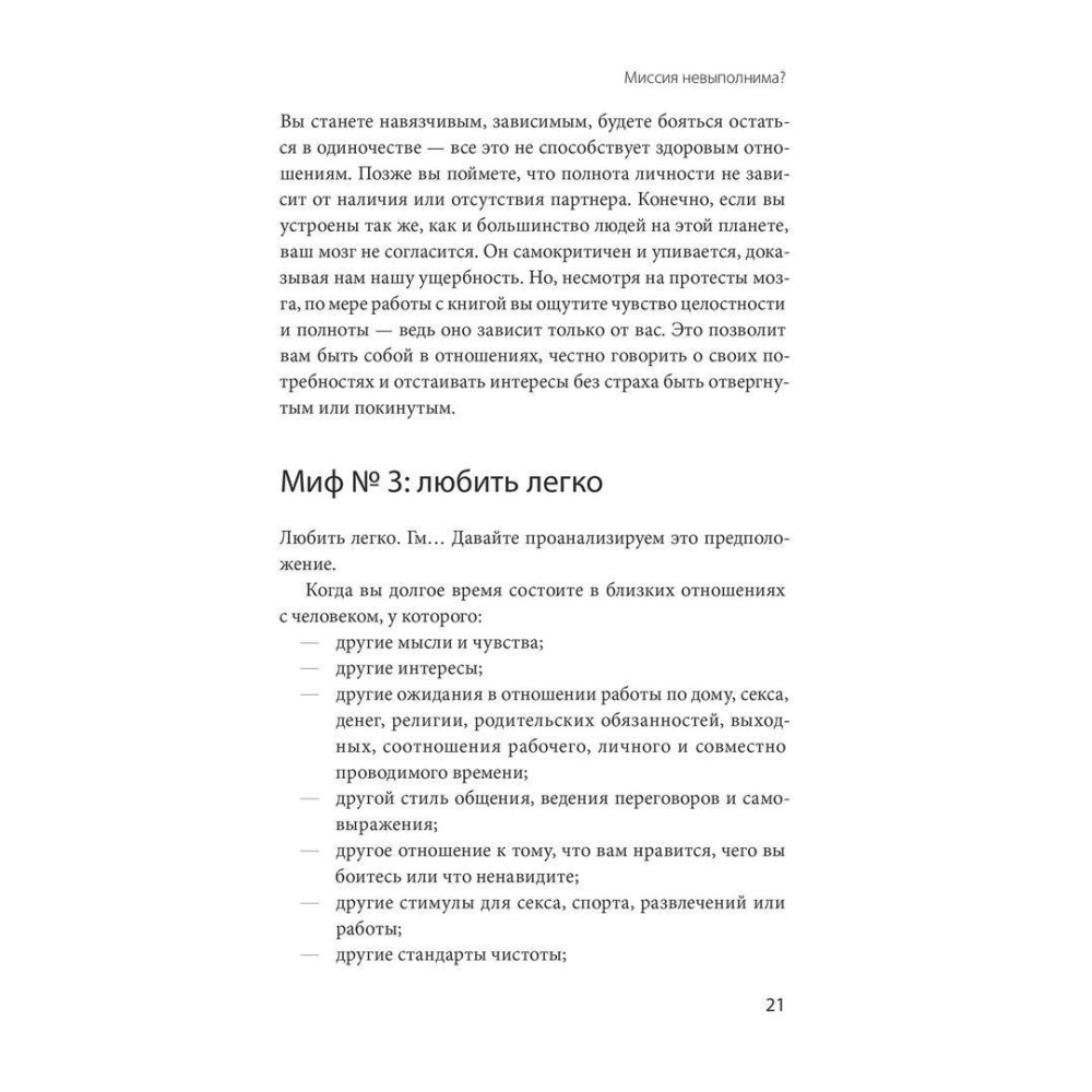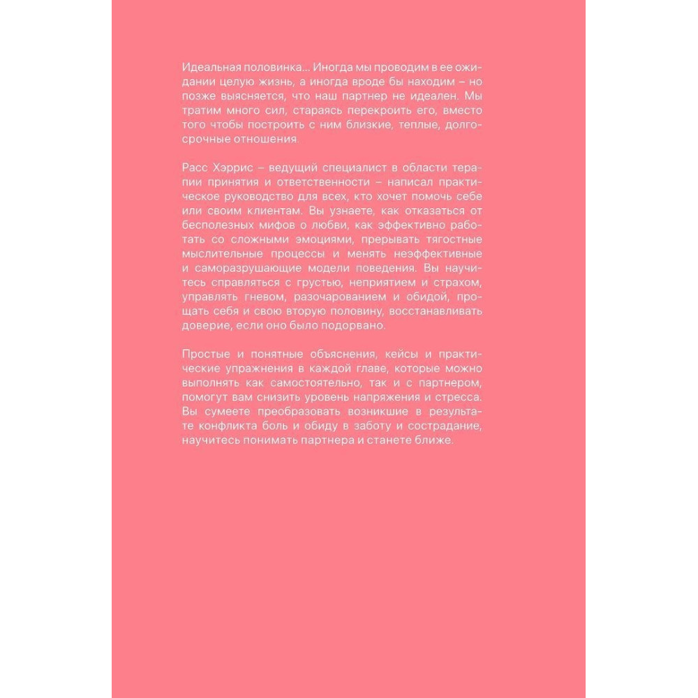 Читаючи ці сторінки, ви зрозумієте, як відмовитися від непотрібних міфів про кохання, як побудувати справжні, близькі, теплі довгострокові стосунки і як реагувати на обтяжливі думки та відчуття, які неминуче виникатимуть. Ви навчитеся справлятися зі смутком, неприйняттям і страхом, керувати гнівом, розчаруванням і образою, прощати себе і свою другу половину, відновлювати довіру, якщо її було підірвано. Ви дізнаєтеся, як знизити рівень напруги і стресу, обговорюючи свої потреби і розбіжності, як перетворити біль і образу, що виникли внаслідок конфлікту, на турботу і співчуття.