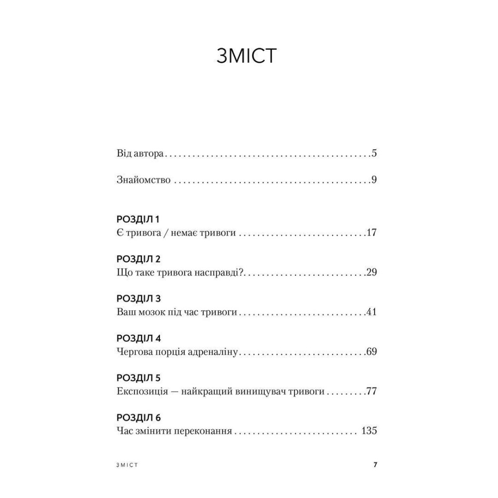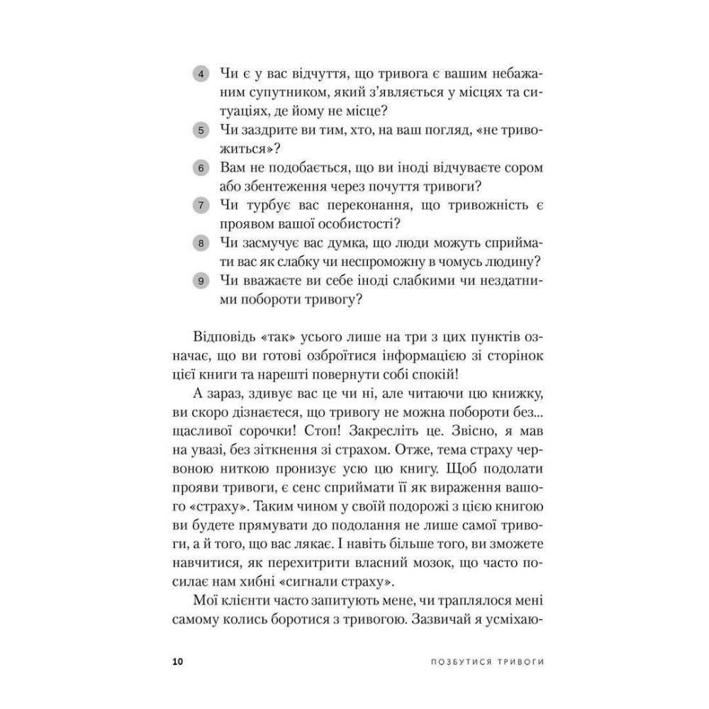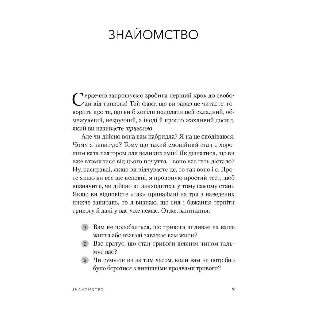 Автор пропонує читачам практичні стратегії та вправи, які допоможуть керувати тривожними станами та подолати негативні думки, що зазвичай змушують нас переживати тривогу. У книзі використовується когнітивно-поведінковий підхід (КПТ), який базується на наукових дослідженнях та є ефективним методом лікування тривожних розладів.