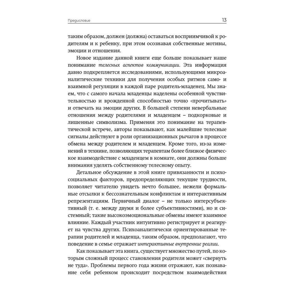 Перший розділ пропонує читачеві теоретичну основу для розуміння ролі емоційного та інтерактивного навколишнього середовища, в якому відбувається розвиток немовляти. Другий розділ запрошує читача до консультаційної кімнати для участі у детальному аналізі стосунків на клінічних зустрічах. Третій — надає матеріал, що ілюструє розвиток терапевтичного процесу.