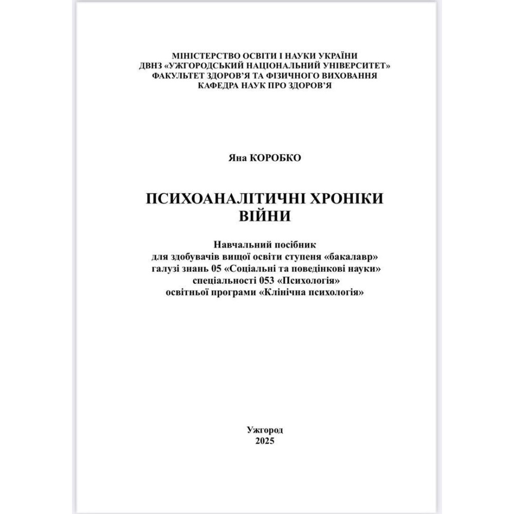 Науковий посібник «Психоаналітичні хроніки війни» за авторством Яни Коробко являє собою інноваційний синтез психоаналітичної теорії та клінічної практики в умовах триваючої війни. Це авторський досвід роботи з людьми, які пережили психотравматичні події повномасштабної війни в Україні з початку 2022 року.