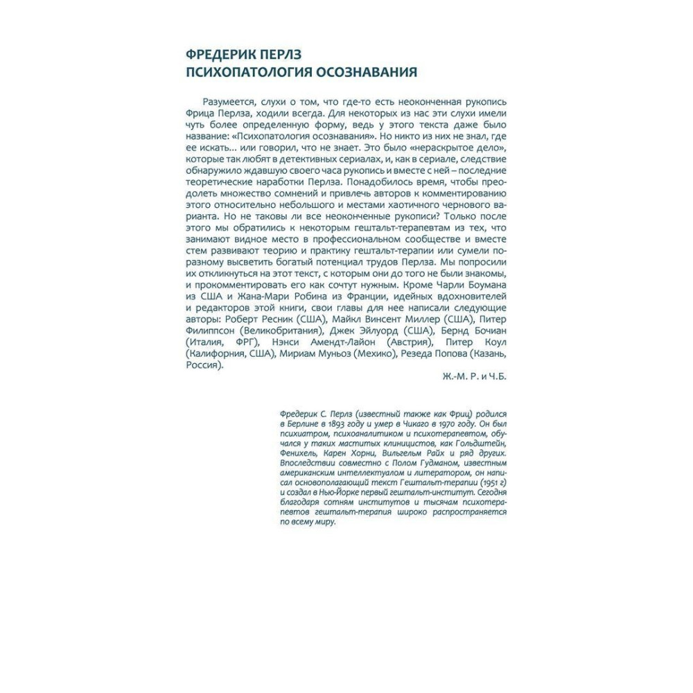 У книзі «Психопатология осознавания. Неоконченная и ранее не публиковавшаяся рукопись с комментариями современных гештальт-терапевтов», яка зібрана під редакцією Жана-Марі Робіна і Чарльза Боумана, представлено незавершений рукопис Фредеріка С. Перлза, де він коментував усіх сучасних гештальт-терапевтів і їхній підхід до терапії. Праця буде особливо корисною для фахівців з відповідних галузей.
