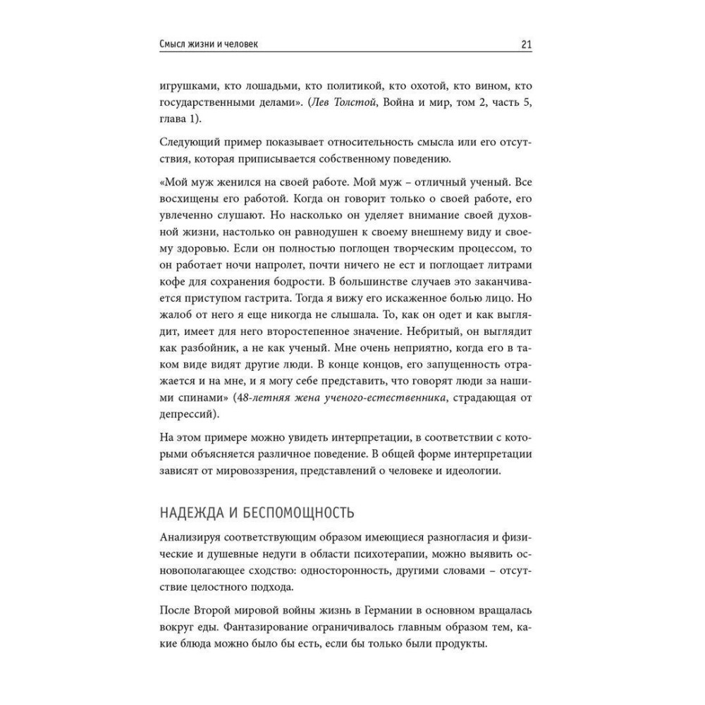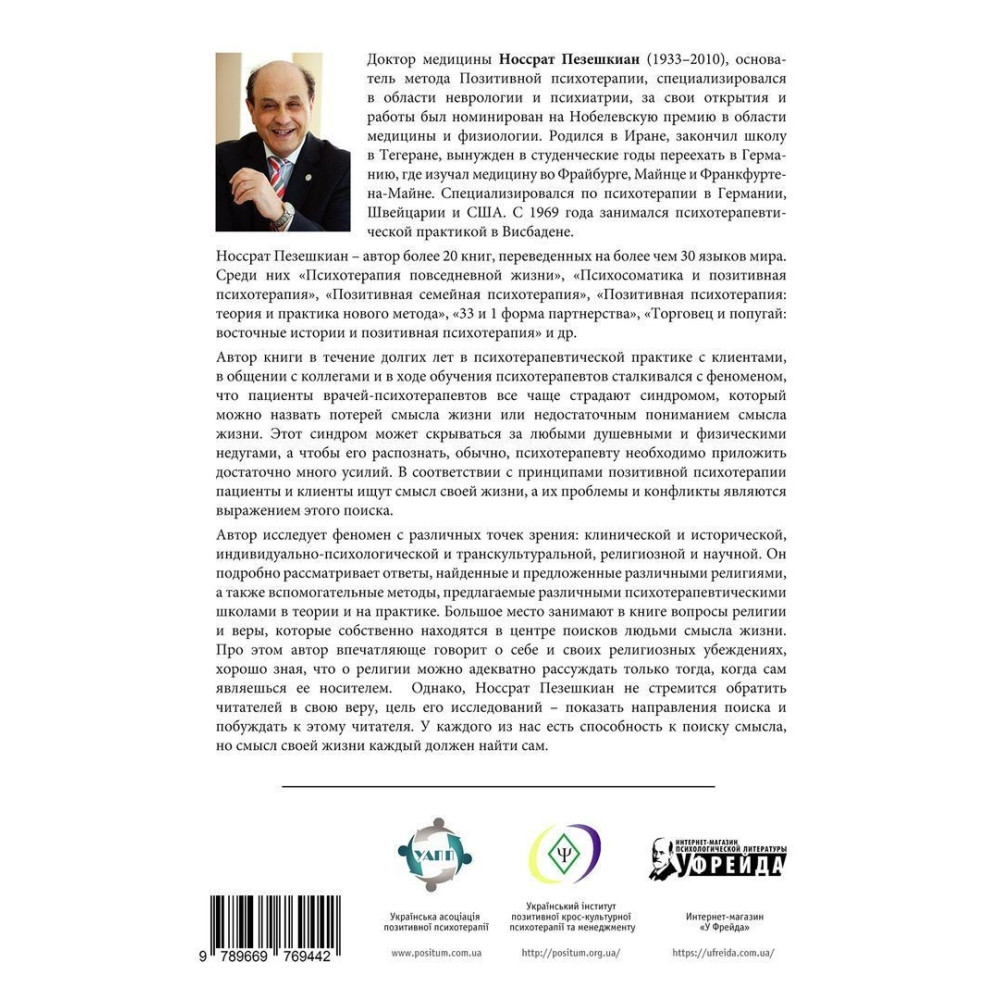 Носсрат Пезешкіан у своїй книзі «В поисках смысла. Психотерапия маленькими шагами» досліджує феномен пошуку сенсу життя з різних точок зору: клінічної та історичної, індивідуально-психологічної та транскультуральної, релігійної та наукової. Він докладно розглядає відповіді, знайдені та запропоновані різними релігіями, а також допоміжні методи, пропоновані різними психотерапевтичними школами в теорії та на практиці. Велике місце посідають у книзі питання релігії та віри, які власне перебувають у центрі пошуків людьми сенсу життя. При цьому автор дуже вражаюче говорить про себе та свої релігійні переконання, добре знаючи, що про релігію можна адекватно міркувати лише тоді, коли сам є її носієм.