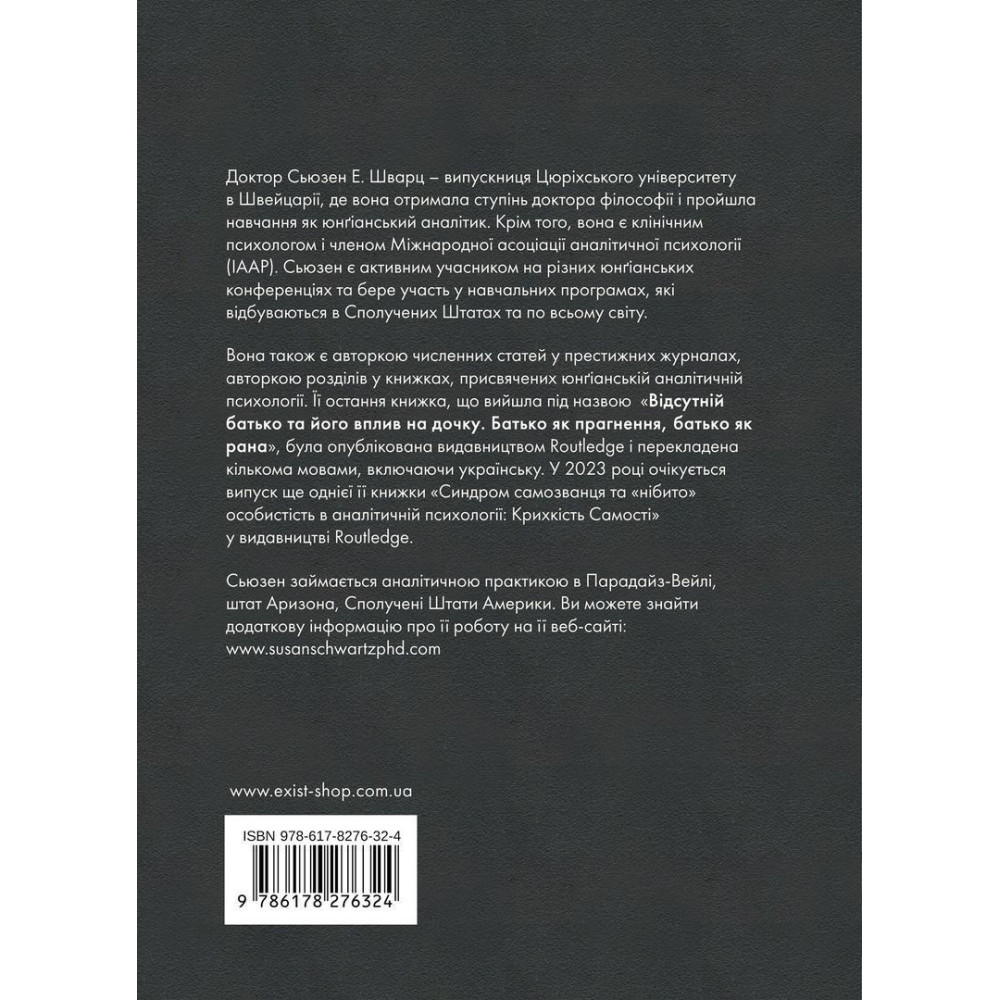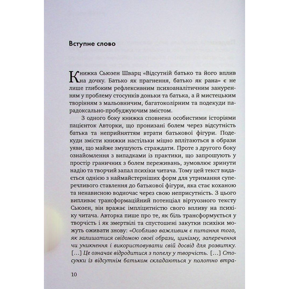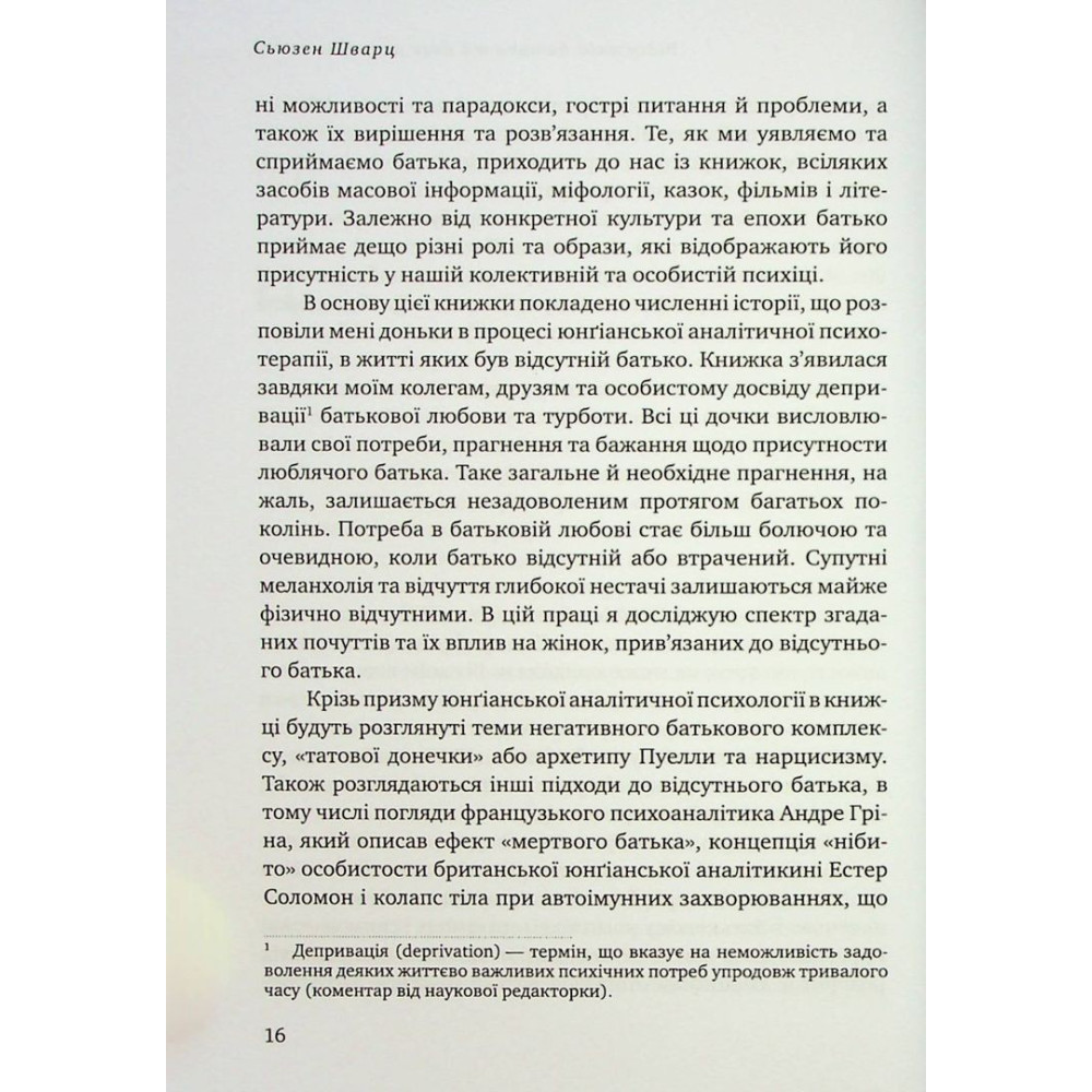 Книга від Сьюзен Шварц «Відсутній батько та його вплив на дочку. Батько як прагнення, батько як рана» глибоко та в деталях розкриває тему психологічних травм, що стосуються доньки, яка виростала без батьківської уваги, як на особистому, так і на соціальному, колективних рівнях.
