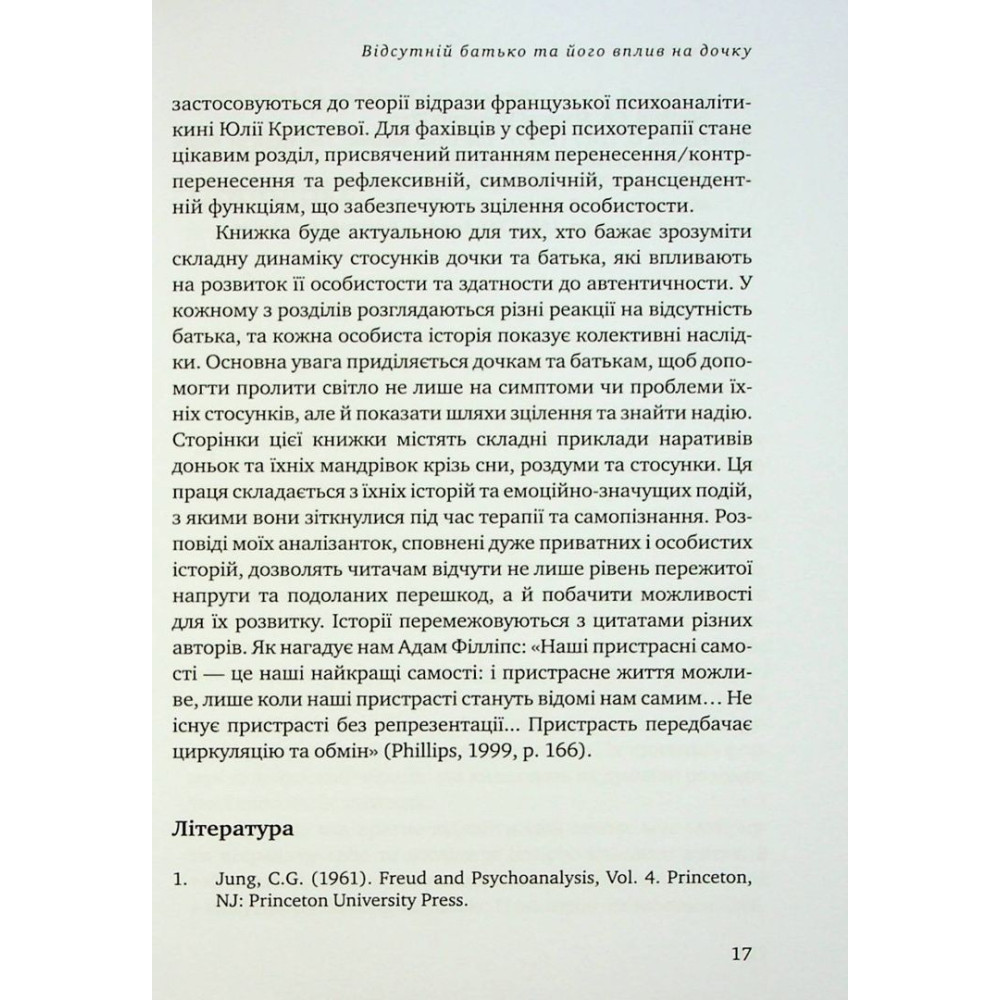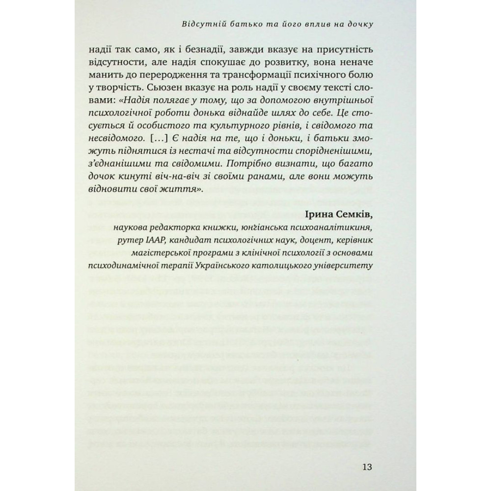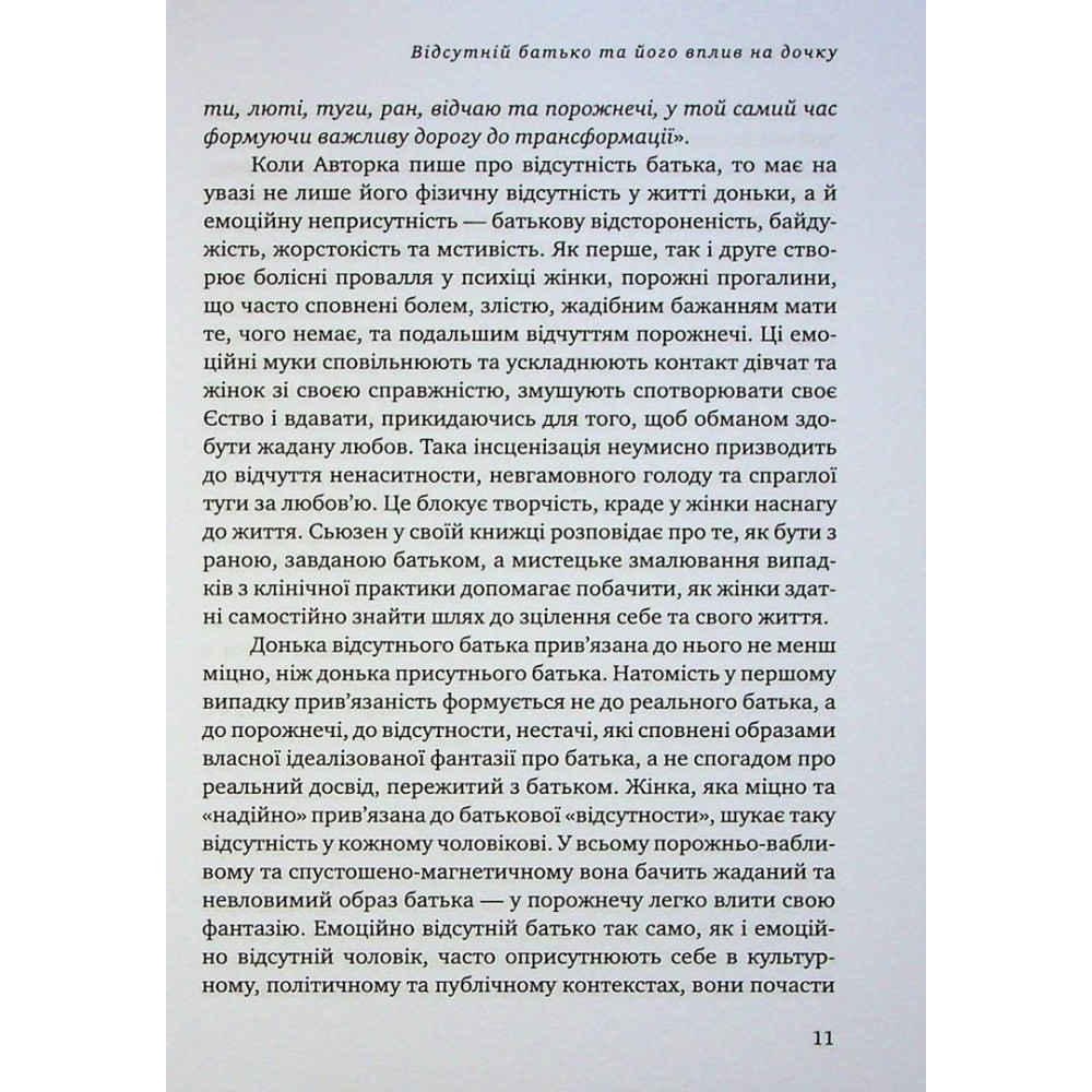 Авторка пропонує унікальний підхід до цієї проблеми, який розширить розуміння і допоможе усвідомити складну динаміку взаємин між батьком та донькою. Зокрема, в книзі докладно розглядаються внутрішні процеси дорослої дочки, яка продовжує підтримувати зв’язок з батьком, який, з різних причин, не надавав їй достатньо уваги. Примітно, що весь текст пронизаний вишуканим співчуттям, без демонізування ролі батька.