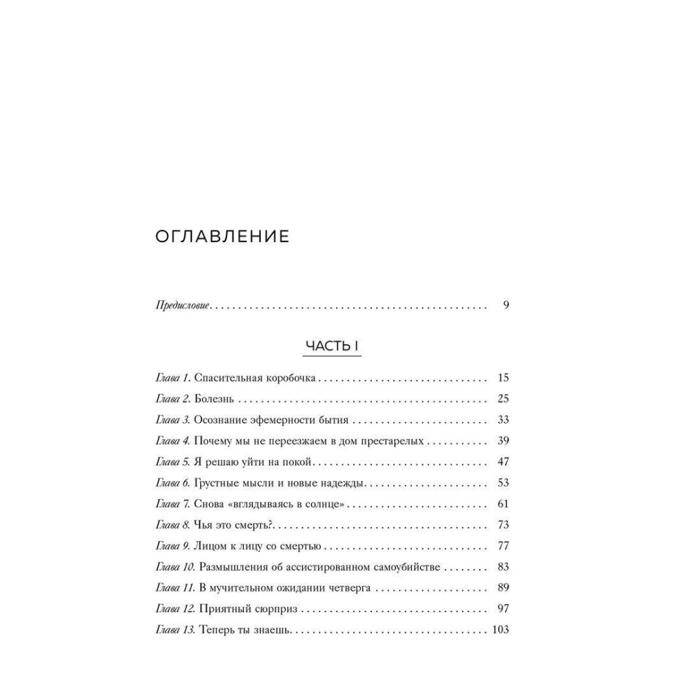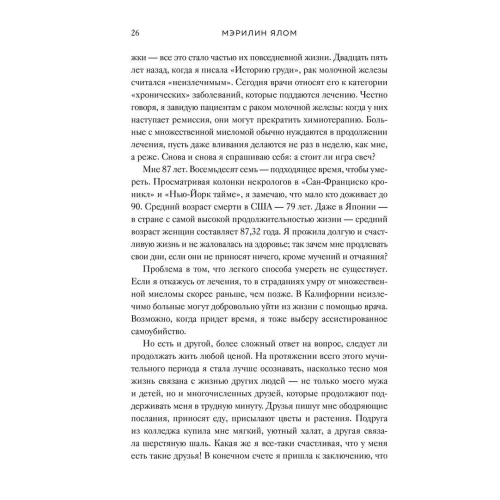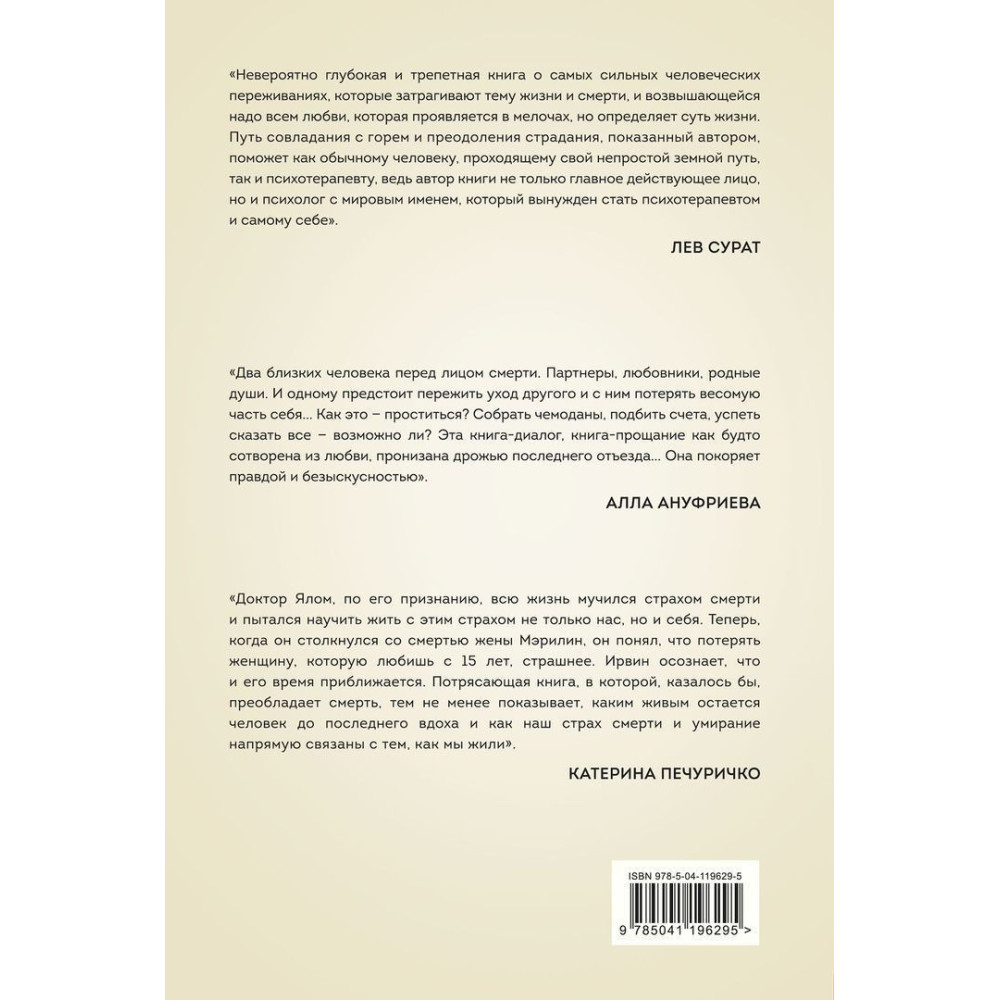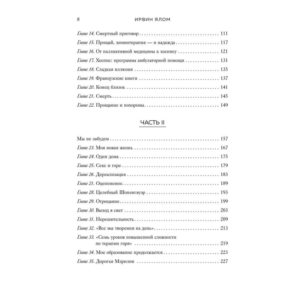Ірвін і Мерилін Яломи зібрали по крихтах усю мудрість прожитих разом років — тут немає настанов і мотиваційних порад, а є досвід людей, що навчилися приймати невідворотне і зуміли змиритися з неминучою розлукою.